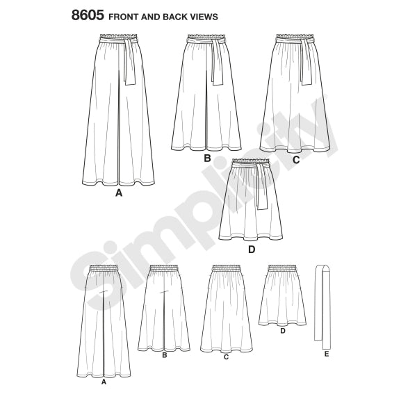 Easy to sew high paper bag waist trousers and skirts for misses sized XS to XL, features pull on design with pockets and tie belt. Trousers have a wide leg. Skirt and pant are available in two lengths.