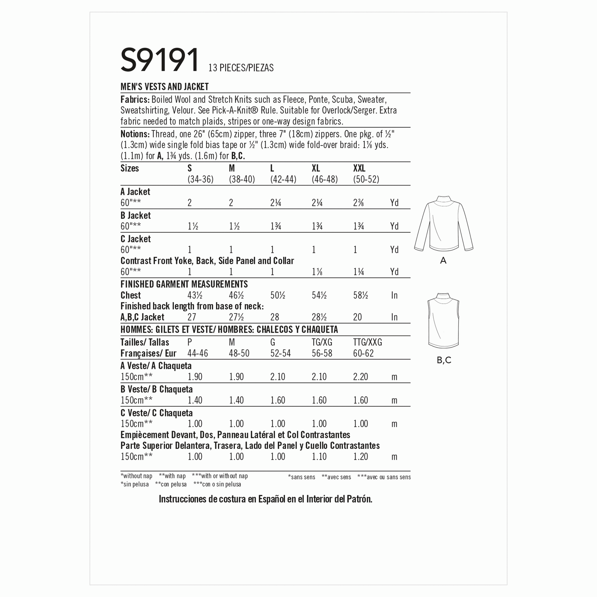 Men’s waistcoats and jacket with stand collar, separating zip, pocket details and side panel; waistcoat C is colour blocked.